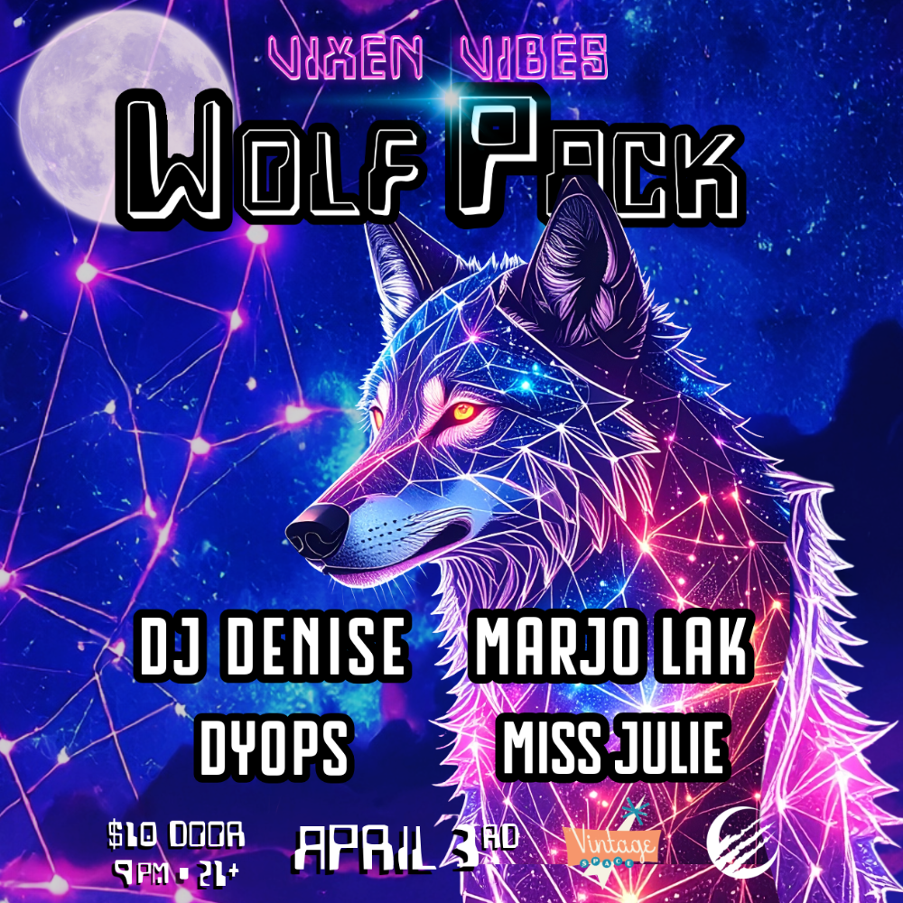 The Wolf Pack is howling back into Vintage Space and this time the Vixens are running the pack. They are ready to take over the dance floor with deep grooves, driving beats, and that wild vixen-energy we all love! We’re bringing in a fierce, all-female DJ lineup of heavy hitters: